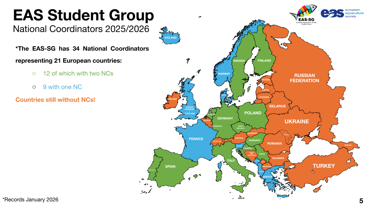 National Coordinators (NCs) are motivated students or recent graduates who represent the EAS Student Group in their country. They act as the main link between local students and the wider EAS-SG community, helping to strengthen aquaculture education, research, and networking across Europe and beyond.