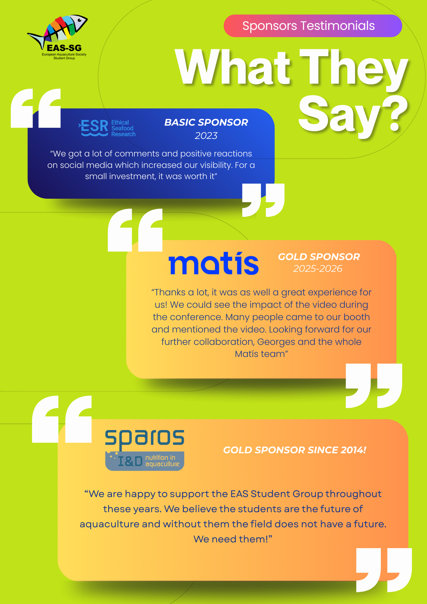 Thanks to the commitment of our sponsors, the EAS Student Group provides travel grants to active National Coordinators (NCs), enabling them to represent their countries, build international networks, and actively contribute to the development of the group. In addition, travel grants are awarded to talented students who submit high quality scientific abstracts to EAS conferences, encouraging excellence, innovation, and early engagement with the professional aquaculture community.